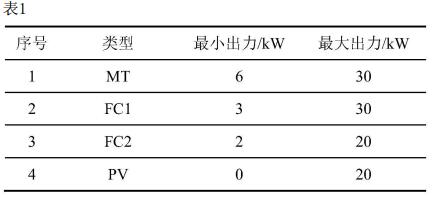 為驗(yàn)證模型及方法的有效性,本發(fā)明通過(guò)優(yōu)化軟件CPLEX進(jìn)行仿真驗(yàn)證。微網(wǎng)系統(tǒng)包含一臺(tái)光伏PV,兩臺(tái)燃料電池FC1、FC2,一臺(tái)微型燃?xì)廨啓C(jī)MT,機(jī)組出力參數(shù)如下表。仿真周期1天,分48個(gè)時(shí)段,每時(shí)段半小時(shí)。典型的負(fù)荷預(yù)測(cè)數(shù)據(jù)和光伏出力預(yù)測(cè)數(shù)據(jù)如附圖2所示。機(jī)組參數(shù)見(jiàn)下表1。