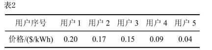 假設(shè)本方法的作用時(shí)段為10:30-13:00。參與的用戶共5戶,每戶均有2kW的空調(diào)設(shè)備參與調(diào)節(jié)。在負(fù)荷側(cè)競(jìng)價(jià)方案下假設(shè)每個(gè)用戶在各時(shí)段的競(jìng)價(jià)價(jià)格相等,下表2為各用戶的競(jìng)價(jià)價(jià)格。
