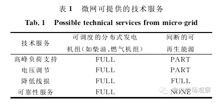 由圖1可看出,集中式電源生產(chǎn)的電力在電力批發(fā)市場(chǎng)的價(jià)格為0.12~0.18元/(kW˙h),而當(dāng)電力到達(dá)終端用戶時(shí)零售電價(jià)達(dá)0.48~0.72元/(kW˙h),電價(jià)提升的原因在于電力從生產(chǎn)到消耗過程中增加了輸電和配電成本(包括升壓/降壓過程的設(shè)備運(yùn)行成本、系統(tǒng)安全運(yùn)營的相關(guān)成本等)。在圖1所示情境下,若采用微網(wǎng)“就地生產(chǎn)、就地消納”模式,則可省去輸配電環(huán)節(jié)的成本,從而減少終端用戶的電費(fèi)支出,在電力市場(chǎng)環(huán)境下還可降低峰荷時(shí)段輸配電環(huán)節(jié)的電網(wǎng)阻塞成本、輔助服務(wù)成本等。隨微網(wǎng)內(nèi)部交易的增加,微網(wǎng)從外部電網(wǎng)購入的電量就會(huì)減少,對(duì)外部配電網(wǎng)的使用率也會(huì)降低,由此配電公司的配電服務(wù)費(fèi)就可能減少。但在實(shí)際運(yùn)行中,配電公司的這種潛在損失可通過微網(wǎng)為其提供的技術(shù)服務(wù)所產(chǎn)生的經(jīng)濟(jì)效益進(jìn)行補(bǔ)償。這種潛在的技術(shù)服務(wù)包括穩(wěn)定電壓、減少線路損耗及保證供電質(zhì)量等,可由微網(wǎng)中不同類型的機(jī)組承擔(dān)(表1),同時(shí)這種技術(shù)服務(wù)既可在一種強(qiáng)制性協(xié)議的基礎(chǔ)上建立,也可在一定區(qū)域內(nèi)的技術(shù)服務(wù)市場(chǎng)中交易獲得(需在市場(chǎng)化的環(huán)境下開展)。