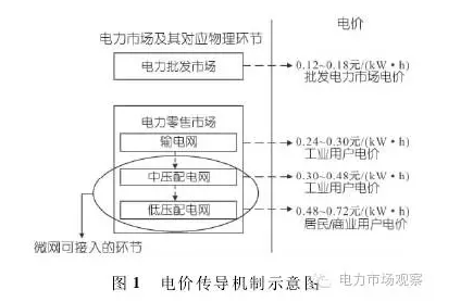 從經(jīng)濟(jì)角度看,微網(wǎng)的收益是通過整合經(jīng)濟(jì)高效的分布式發(fā)電資源以實(shí)現(xiàn)微網(wǎng)內(nèi)部用戶和發(fā)電主體的直接購售電交易,即“就地生產(chǎn)、就地消納”的購售電模式來實(shí)現(xiàn)的,微網(wǎng)的收益來源于系統(tǒng)內(nèi)外部電價(jià)的差額,見圖1。