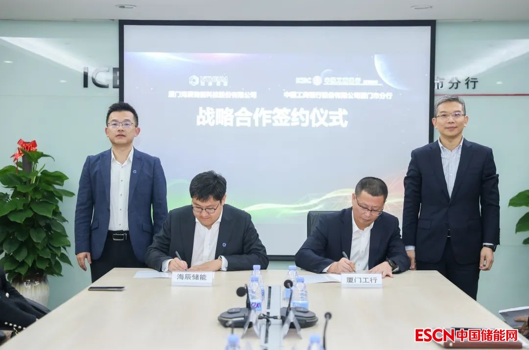 海辰儲能聯(lián)合創(chuàng)始人、總經(jīng)理王鵬程,工商銀行廈門市分行黨委書記、行長張江山共同見證,海辰儲能董事、副總經(jīng)理龐文杰、工商銀行廈門市分行副行長陳大文代表雙方簽約。