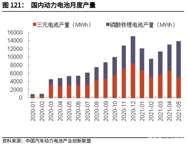 2020 年動(dòng)力電池產(chǎn)量前低后高,2020 年二季度出現(xiàn)了減產(chǎn)的情況,之后逐月增 量,20Q4 高速增長(zhǎng),一直持續(xù)到 2021Q1。三元電池產(chǎn)量同比增長(zhǎng)穩(wěn)健,主要 是磷酸鐵鋰電池產(chǎn)量快速增長(zhǎng),2020 年 12 月同比增速達(dá)到 452%。