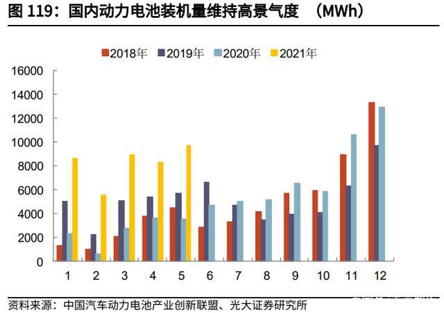 新能源汽車需求旺盛帶動(dòng)了動(dòng)力電池產(chǎn)業(yè)鏈公司的產(chǎn)量增長(zhǎng),2021 上半年鋰電 產(chǎn)業(yè)鏈公司均處于滿產(chǎn)狀態(tài),部分環(huán)節(jié)例如電解液、六氟磷酸鋰等甚至出現(xiàn)了產(chǎn) 能緊張、供不應(yīng)求的情況。正極、負(fù)極、隔膜、電解液企業(yè)月度產(chǎn)量環(huán)比不斷增 長(zhǎng)。