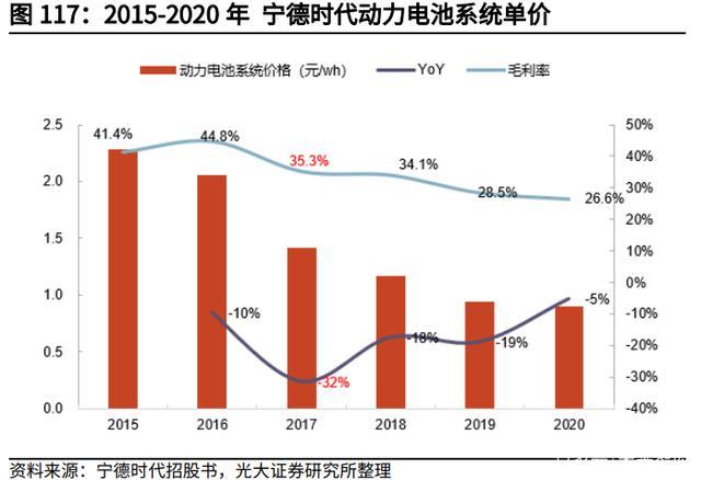 動(dòng)力電池企業(yè)具有較強(qiáng)成本消化能力。以寧德時(shí)代為例,2017 年動(dòng)力電池系統(tǒng) 價(jià)格為 1.41 元/Wh,同比下降 32%,2014-2017 年年均復(fù)合降幅為 21.3%。2017 年,由于受到下游補(bǔ)貼退坡和上游漲價(jià)的雙重壓力,電池系統(tǒng)平均價(jià)格同比下降 32%,而毛利率僅下降 9.5pcts,電池價(jià)格降幅大于毛利率降幅。未來(lái)動(dòng)力電池降本趨緩,且下游市場(chǎng)化轉(zhuǎn)變不再依賴補(bǔ)貼,動(dòng)力電池企業(yè)面臨的成本壓力僅來(lái) 自于上游漲價(jià),盈利壓力相對(duì)較輕。