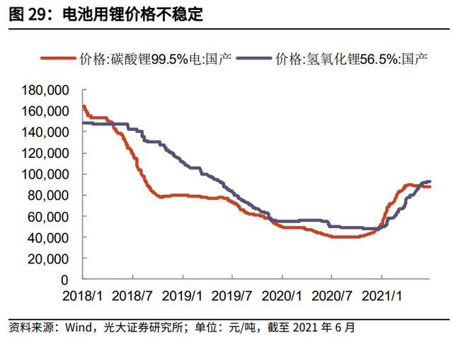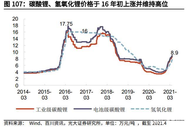 (1)根據(jù)鋰鹽的歷史價(jià)格,可以看出中國(guó)鋰鹽在 2015 年之前處于供需平衡狀 態(tài),碳酸鋰和氫氧化鋰的價(jià)格主要在 4 萬(wàn)元/噸上下波動(dòng),整體變化不大。2015 年起,隨著中國(guó)新能源汽車的快速發(fā)展,國(guó)內(nèi)鋰鹽市場(chǎng)供小于求,鋰鹽價(jià)格大幅 快速上漲。2016 年電池級(jí)碳酸鋰的價(jià)格漲至近 18 萬(wàn)元/噸。
