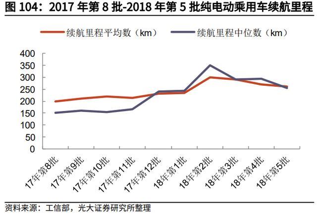 我們梳理了新能源汽車推薦目錄(2017 年第 8 批-2018 年第 5 批),新發(fā)布車 型和變更擴(kuò)展車型中,純電動(dòng)乘用車?yán)m(xù)航里程的均值和中位數(shù)總體表現(xiàn)出提升趨 勢(shì),2017 年第 8 批-2018 年第 5 批,均值由 199km 提升至 277km,中位數(shù)由 155km 提升至 270km;純電動(dòng)乘用車電池系統(tǒng)能量密度也表現(xiàn)出增長(zhǎng)趨勢(shì),均 值由 123Wh/kg 提升至 133Wh/kg,中位數(shù)由 126Wh/kg 提升至 135Wh/kg。
