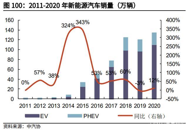 得益于我國(guó)強(qiáng)大的抗疫組織能力,2020 年我國(guó)新能源汽車銷量態(tài)勢(shì)良好,四月 起銷量便企穩(wěn)并不斷回升。根據(jù)中汽協(xié)數(shù)據(jù),2020 年我國(guó)新能源車銷量 136.7 萬(wàn)輛,同比增長(zhǎng) 10.9%。其中,純電動(dòng)汽車銷量為 109.4 萬(wàn)輛,同比增 11.6%; 插電式混合動(dòng)力汽車銷量為 24.9 萬(wàn)輛,同比增長(zhǎng) 8.4%,電動(dòng)車滲透率從 2019 年的 4.7%提升至 2020 年的 5.4%。