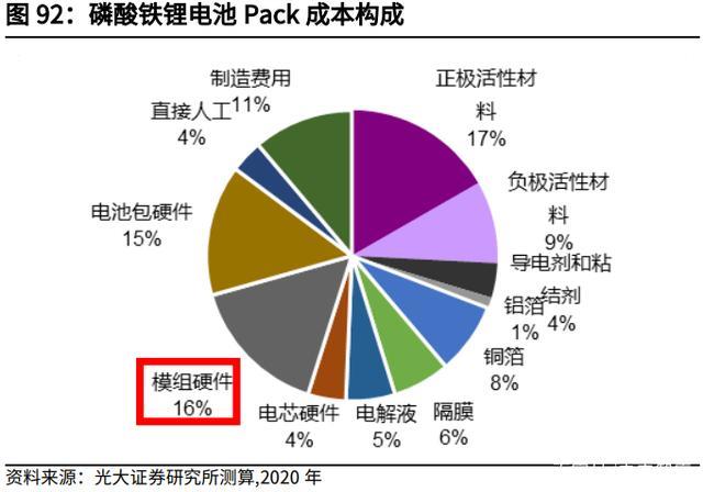 動(dòng)力電池 Pack 主要由電芯、模組硬件、電池包硬件構(gòu)成。據(jù)我們的動(dòng)力電池 Pack 成本構(gòu)成模型可見,電芯硬件在成本構(gòu)成中占比約不到 5%,模組硬件占 比約 13-16%,因此可以通過整合精裝電芯、模組硬件來(lái)達(dá)到降低成本的目的。