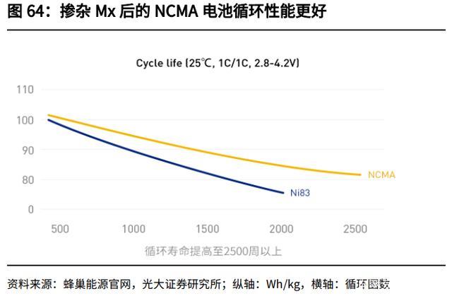 單晶化:目前三元材料多為細(xì)小晶粒(直徑幾百 nm)團(tuán)聚成的二次球形多晶顆 粒(直徑幾 μm 到幾十 μm),多晶三元材料由于顆粒內(nèi)部存在應(yīng)力導(dǎo)致材料循 環(huán)過程中易開裂,而存在循環(huán)壽命短、熱穩(wěn)定性差的缺陷。單晶顆粒(粒徑通常 在 5μm 以下甚至納米級(jí))相對(duì)于多晶顆粒,在輥壓時(shí)不會(huì)破碎,有效地提高了 材料的壓實(shí)密度,且單晶顆粒結(jié)構(gòu)穩(wěn)定性好,能在長(zhǎng)循環(huán)后保持原狀,提高安全 性能。