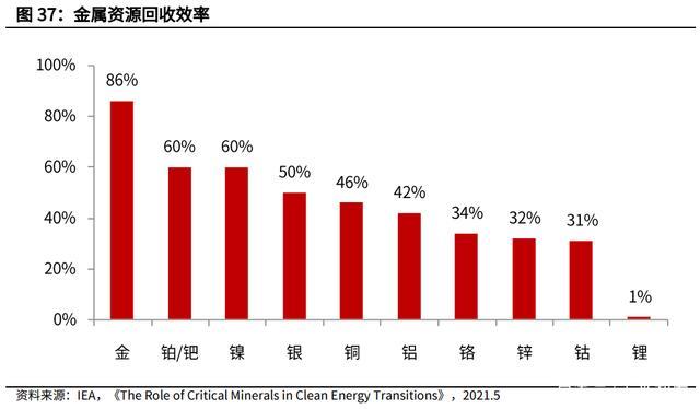 未來(lái),廢舊動(dòng)力鋰電池回收將會(huì)形成一個(gè)十分龐大的市場(chǎng)。目前全球?qū)τ阡嚭拖?土資源供給(電池和電機(jī)的核心礦物資源),還是圍繞一次資源提取供給為主。 根據(jù) IEA 的報(bào)告,當(dāng)下中鎳、鈷的回收率還可以,但鋰幾乎沒有回收能力(回收 率<1%)。我們可以預(yù)見進(jìn)入 TGWh 時(shí)代后,鋰電池大規(guī)模退役,上游礦物資 源缺口會(huì)引發(fā)龐大的回收浪潮。