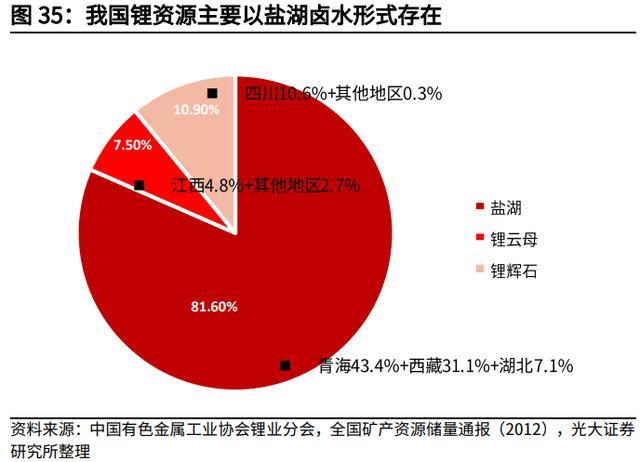 據(jù)中國(guó)有色金屬工業(yè)協(xié)會(huì)鋰業(yè)分會(huì)統(tǒng)計(jì),鋰資源儲(chǔ)量約為 714 萬(wàn)噸(金屬鋰噸), 其中青海地區(qū)的儲(chǔ)量占全國(guó)的 43.4%,西藏地區(qū)的儲(chǔ)量占全國(guó)的 31.1%,是占 比最高的兩個(gè)地區(qū)。我國(guó)鋰資源主要以鹽湖鹵水形式存在,占比高達(dá) 81.6%。 因此在全球鋰電市場(chǎng)大跨步邁向 TWh 時(shí)代之際,加大我國(guó)鹽湖鋰資源的開發(fā)力 度勢(shì)在必行,鹽湖提鋰也將構(gòu)成未來(lái)我國(guó)甚至全球新增鋰礦產(chǎn)能的主體。
