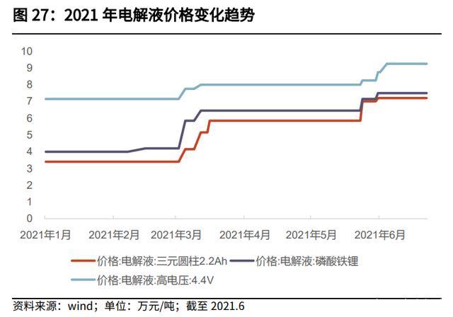電解液供應(yīng)緊張,尤其受限于上游的 6F、VC 供應(yīng)。2021 年以來(lái),電解液價(jià)格 持續(xù)上漲,上游的 6F 價(jià)格漲幅大于電解液價(jià)格漲幅。根據(jù) wind 數(shù)據(jù),三元圓 柱 2.2Ah/磷酸鐵鋰/4.4V 高電壓電解液價(jià)格 2021 年 1 月出的價(jià)格為 3.4/4/7.15 萬(wàn)元/噸,到 2021 年 6 月末,價(jià)格已上漲到 7.2/7.5/9.25 萬(wàn)元/噸,漲幅為 112%/88%/29%;6F 價(jià)格 2021 年 1 月初的價(jià)格為 11.25 萬(wàn)元/噸,到 2021 年 6 月末,價(jià)格已上漲到 31.5 萬(wàn)元/噸,漲幅為 180%。