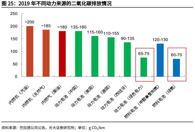 針對(duì)于不同車用動(dòng)力源的全生命周期排碳水平,全球氫燃料電池龍頭巴拉德公司 也進(jìn)行了測(cè)算,其核心結(jié)論在于:能源供給側(cè)的清潔程度是決定因素,無(wú)論是鋰 電池汽車還是氫燃料電池車,如果電力或者氫氣來(lái)自于化石能源,那么其排碳水 平依然較高。所以若要能源需求側(cè)的汽車使用端減碳,還是需要推動(dòng)能源供給側(cè) 使用清潔能源。如果能源供給側(cè)均使用清潔能源,那么鋰電池汽車和氫燃料電池 汽車全生命周期排碳水平分別為 65-75 g/km;60-70 g/km。