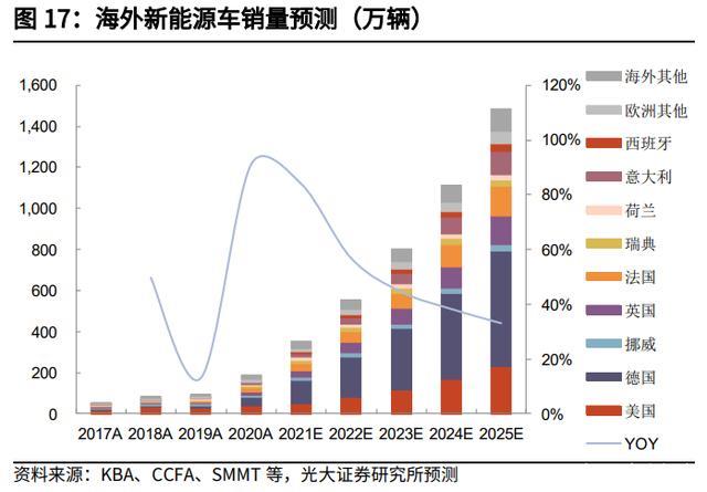 預(yù)計(jì) 2025 年海外新能源汽車銷量 1500 萬(wàn)輛,動(dòng)力電池裝機(jī)量 757GWh