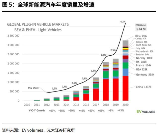 盡管 2020 年的新冠疫情導(dǎo)致全球汽車總銷量下滑了 14%,但全球電動(dòng)汽車的銷 量卻在 2020 年逆勢(shì)大漲,達(dá)到 320 萬(wàn)輛以上。根據(jù) EV volumes 數(shù)據(jù),2020 年全球新能源汽車的的銷量為 324 萬(wàn),而 2019 年同期為 226 萬(wàn),同比增長(zhǎng)了 43.36%。