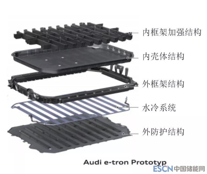 這種結構的托盤,框架結構特點不明顯,但是,整體強度可以滿足電池承截要求。常見于小能量電池系統(tǒng)結構。如下圖的Audi A3壓鑄托盤。