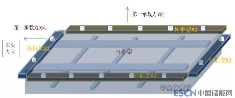 如下圖所示,兩側外框架A,是電池系統(tǒng)Z向矢量的第一承載者;前后外框架B,主要承載來自X向的矢量載荷。所以說,關系到托盤吊耳位置或結構設計,就必須考慮這個因素。