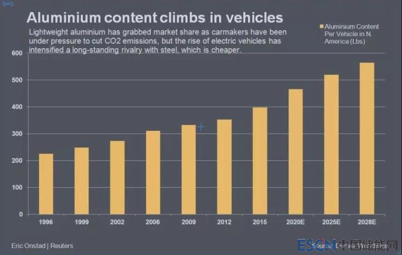 達克全球咨詢對北美車均鋁用量進行了調研和預測,它們發(fā)現從1996年以來,鋁在車輛中應用呈現出逐年增長的趨勢,且自2012年開始出現攀升態(tài)勢。2015年時車用鋁含量已經達到400磅/輛(約合181kg/輛),到2020年則超過450磅/輛(約合204kg/輛),到2028年突破550磅/輛(約合249kg/輛)