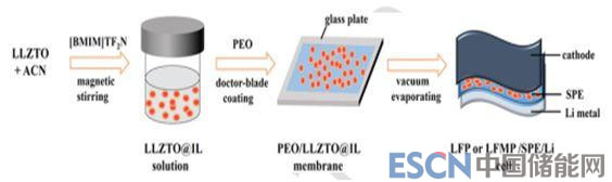 Singh等用[BMP]TFSI離子液體作為增塑劑,將其加入PEO-LiTFSI體系,制得的聚合物電解質(zhì)能在340-360℃間保持熱穩(wěn)定,當(dāng)離子液體含量30%時(shí),離子電導(dǎo)率為2.5×10-5S/cm,電化學(xué)窗口5.2V(25℃)。Guo[31]等用微量(1.8μl/cm2)離子液體[BMIM]TF2N作為增塑劑,將其用于PEO/LLZTO體系(合成如圖6),由于離子液體的潤(rùn)濕作用,降低了PEO與LLZTO間以及電極與電解質(zhì)間的界面阻抗,離子電導(dǎo)率達(dá)到2.2×10-4S/cm(20℃),并在LiFePO4/Li和LiFe0.15Mn0.85PO4/Li電池體系中(25℃)展示了優(yōu)異的倍率循環(huán)性能。