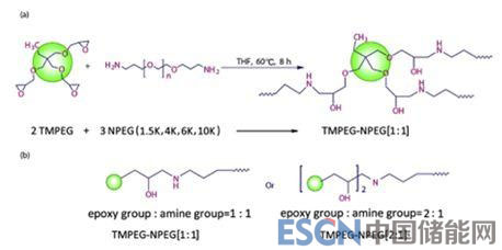 Xu等利用氨基與環(huán)氧基團(tuán)的化學(xué)反應(yīng),一步法簡(jiǎn)便地合成了具有交聯(lián)網(wǎng)狀結(jié)構(gòu)的聚合物電解質(zhì)TMPEG-NPEG(合成路徑如圖7),通過改變TMPEG和NPEG的比例可以有效地調(diào)控交聯(lián)網(wǎng)狀結(jié)構(gòu),發(fā)現(xiàn)當(dāng)環(huán)氧基團(tuán)/氨基基團(tuán)=2:1時(shí),制得的聚合物電解質(zhì)TMPEG-NPEG4K[2:1]-16:1具有最佳的綜合性能,離子電導(dǎo)率為1.1×10-4S/cm(30℃),好的熱穩(wěn)定性和機(jī)械性能,電化學(xué)窗口達(dá)到5.4V,在LiFePO4/Li的電池體系中展示了比純PEO基電解質(zhì)更為優(yōu)異的循環(huán)倍率性能。