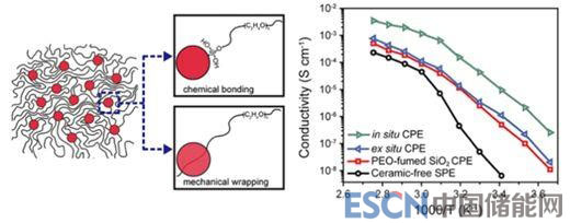 圖8(左)原位合成的SiO2與PEO鏈間的作用機(jī)理;(右)離子電導(dǎo)阿倫尼烏斯曲線