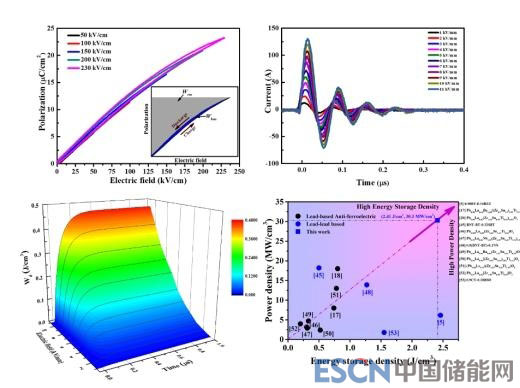 小型化和輕量化一直是儲能電容器的重要發(fā)展趨勢。為此,該團(tuán)隊聚焦尚無文獻(xiàn)報道的鈮酸鈉(NaNbO3)體系。NaNbO3的體積密度僅為4.55g/cm3,相比鐵酸鉍(8.37g/cm3)、鈦酸鋇(6.02g/cm3)、鈦酸鉍鈉 (5.977g/cm3)等其它無鉛介質(zhì)材料體系,它在儲能電容器的輕量化方面具有明顯的優(yōu)勢。然而,電場誘導(dǎo)的亞穩(wěn)態(tài)鐵電性和堿金屬鈉元素?fù)]發(fā)導(dǎo)致的耐電強(qiáng)度低制約了NaNbO3在儲能方面的應(yīng)用。該團(tuán)隊先后采用順電體調(diào)控和A位空位策略來增強(qiáng)NaNbO3的儲能特性,構(gòu)筑了兩種新型的NaNbO3基儲能介質(zhì)陶瓷材料:NaNbO3-SrTiO3和Na1-3xBixNbO3。這兩種NaNbO3基儲能介質(zhì)陶瓷材料均表現(xiàn)出了優(yōu)異的儲能特性、充放電特性及穩(wěn)定性,其中Na1-3xBixNbO3的綜合儲能特性(儲能密度:4.03J/cm3、儲能效率:85.4%、功率密度:62.5 MW/cm3)為目前文獻(xiàn)報道的最優(yōu)值。該工作為NaNbO3材料開辟了新的應(yīng)用方向,同時也為設(shè)計高儲能無鉛介質(zhì)材料提供了新的方法和思路。相關(guān)研究成果發(fā)表在Journal of Materials Chemistry A (J. Mater. Chem. A, 2018,6, 17896-17904)和ACS Sustainable Chemistry & Engineering (ACS Sustainable Chem. Eng. 2018, 6, 10, 12755-12765)上。