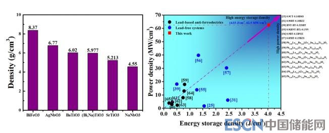 幾種典型無鉛介質(zhì)材料體系的體積密度對比圖(左)和Na1-3xBixNbO3綜合儲能特性與文獻(xiàn)對比圖(右)