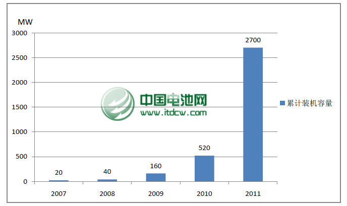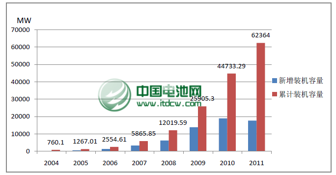 中國儲能網(wǎng)訊:過去幾年,在全球變暖的碳減排壓力和化石能源不可持續(xù)的危機(jī)之下,世界各國以風(fēng)能,太陽能為代表的全球可再生能源開發(fā)日益加快。以風(fēng)能為例(上圖),2004~2011 的七年內(nèi),累計(jì)裝機(jī)容量從760.1MWh 增長到62364MWh,年均增長87%,呈現(xiàn)出迅猛的增長勢頭。光伏發(fā)電裝機(jī)在過去幾年同樣增速客觀(下圖),2011 年裝機(jī)容量達(dá)到2700MW,過去4 年年均增長率為240%,目前風(fēng)電加光伏的累計(jì)裝機(jī)容量占全國發(fā)電總裝機(jī)容量6.1%,預(yù)計(jì)到2015 年,風(fēng)能加光伏的累計(jì)裝機(jī)容量將占發(fā)電總裝機(jī)容量7.1%,其中風(fēng)電預(yù)計(jì)累計(jì)裝機(jī)容量為100GW,光伏裝機(jī)容量達(dá)到5GW。過去幾年,在全球變暖的碳減排壓力和化石能源不可持續(xù)的危機(jī)之下,發(fā)電功率不穩(wěn)定是制約風(fēng)力發(fā)電,光伏發(fā)電等新能源利用效率的重要因素。根據(jù)電監(jiān)會統(tǒng)計(jì)數(shù)據(jù),我國風(fēng)電去年棄風(fēng)量占全年發(fā)電量的20%,約150 億-180 億度,光伏電站也出現(xiàn)了“棄光”的現(xiàn)象。出現(xiàn)以上現(xiàn)象是原因是現(xiàn)階段多數(shù)風(fēng)電基地遠(yuǎn)離負(fù)荷中心,所在地區(qū)的電網(wǎng)結(jié)構(gòu)薄弱,風(fēng)電需要高電壓大容量遠(yuǎn)距離輸送。而風(fēng)電隨機(jī)性和反調(diào)峰性的特點(diǎn),使主網(wǎng)調(diào)峰調(diào)壓、頻率控制等方面難度增加,加大了電網(wǎng)安全穩(wěn)定運(yùn)行的風(fēng)險(xiǎn)。