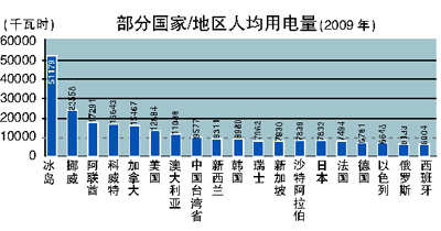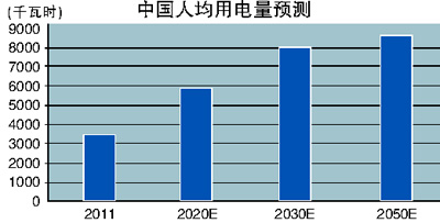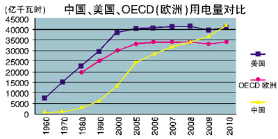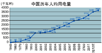 2011年,我國全社會用電量4.7萬億度,超過美國,排名世界第一。2011年,我國人均用電量3490度,比世界平均水平高約450度,排名世界第五十五位左右。過去十年,我國人均用電量凈增2340度。