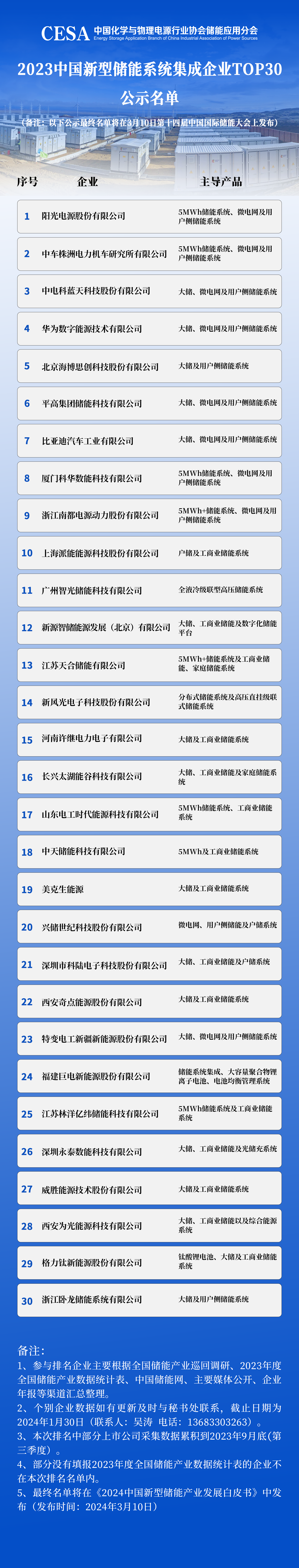 本次儲(chǔ)能產(chǎn)業(yè)鏈百?gòu)?qiáng)企業(yè)評(píng)選活動(dòng)針對(duì)的對(duì)象主要是 CESA 儲(chǔ)能應(yīng)用分會(huì)廣大會(huì)員企業(yè)和與儲(chǔ)能業(yè)務(wù)緊密相關(guān)的上市公司,評(píng)價(jià)數(shù)據(jù)以2023年為準(zhǔn),主要通過協(xié)會(huì)實(shí)地走訪調(diào)研、會(huì)員企業(yè)年度數(shù)據(jù)申報(bào)、媒體披露和上市公司年報(bào)等多個(gè)渠道,最終形成2023中國(guó)新型儲(chǔ)能鋰離子電池企業(yè)TOP20、2023中國(guó)新型儲(chǔ)能系統(tǒng)集成企業(yè)TOP30、2023中國(guó)新型儲(chǔ)能PCS企業(yè)TOP30、2023中國(guó)新型儲(chǔ)能液流電池企業(yè)TOP30、2023中國(guó)工商業(yè)儲(chǔ)能企業(yè)TOP60、2023中國(guó)新型儲(chǔ)能BMS企業(yè)TOP10、2023中國(guó)新型儲(chǔ)能飛輪儲(chǔ)能企業(yè)TOP10、2023中國(guó)新型儲(chǔ)能溫控系統(tǒng)企業(yè)TOP20、2023中國(guó)新型儲(chǔ)能消防與安全企業(yè)TOP 20、2023中國(guó)新型儲(chǔ)能壓縮空氣儲(chǔ)能企業(yè)TOP10及2023中國(guó)新型儲(chǔ)能產(chǎn)業(yè)企業(yè)TOP100名單。