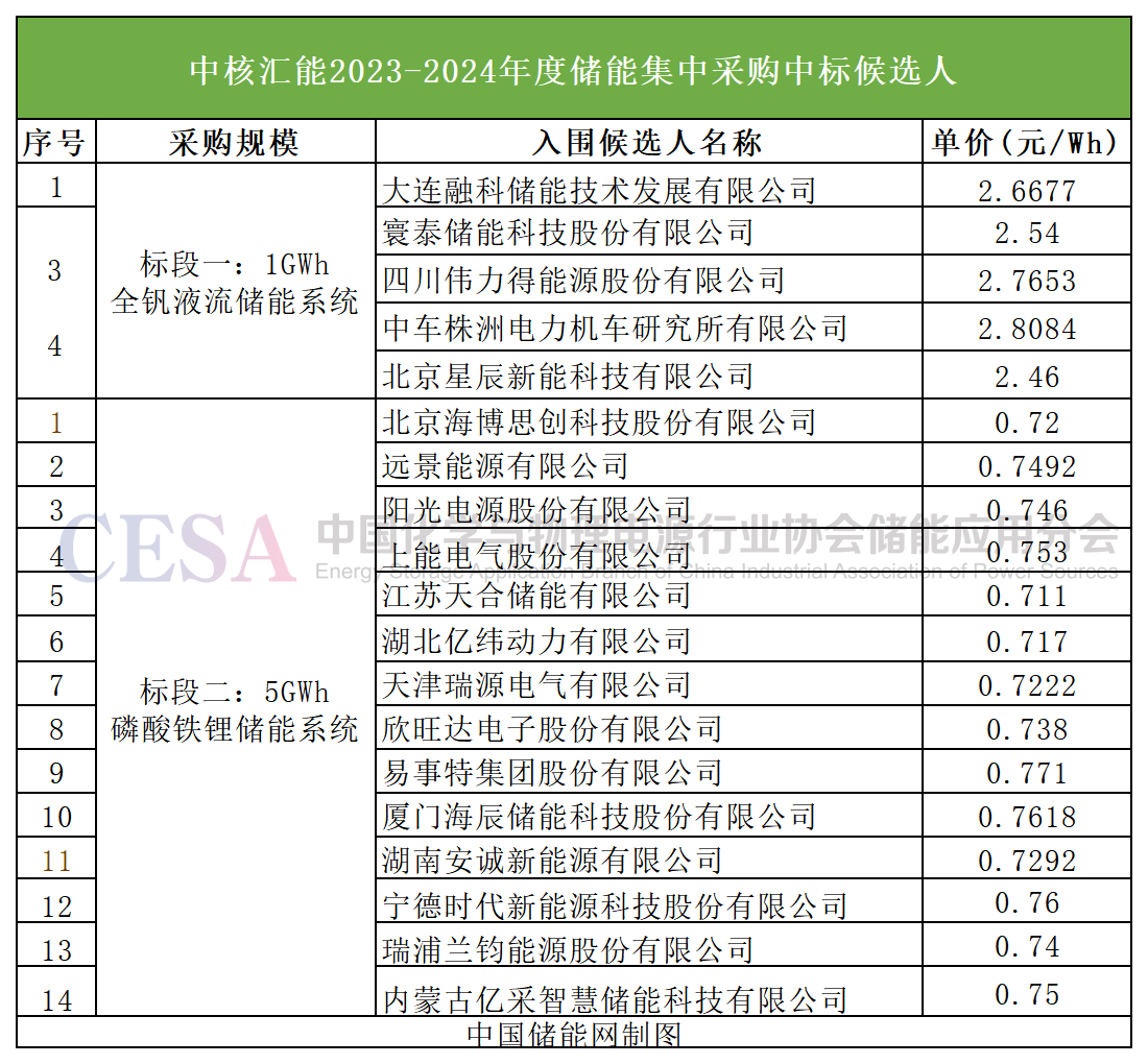 中核匯能此次集采總?cè)萘繛?GWh,包括1GWh全釩液流電池儲(chǔ)能系統(tǒng)和5GWh磷酸鐵鋰儲(chǔ)能系統(tǒng),共有19家企業(yè)入圍。