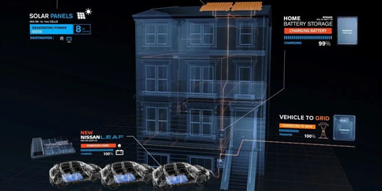 圖:尼桑汽車公司公布的電動汽車反向充電示意圖,與戶用光伏、家庭儲能配合,充分與電網(wǎng)連接,提高使用效率