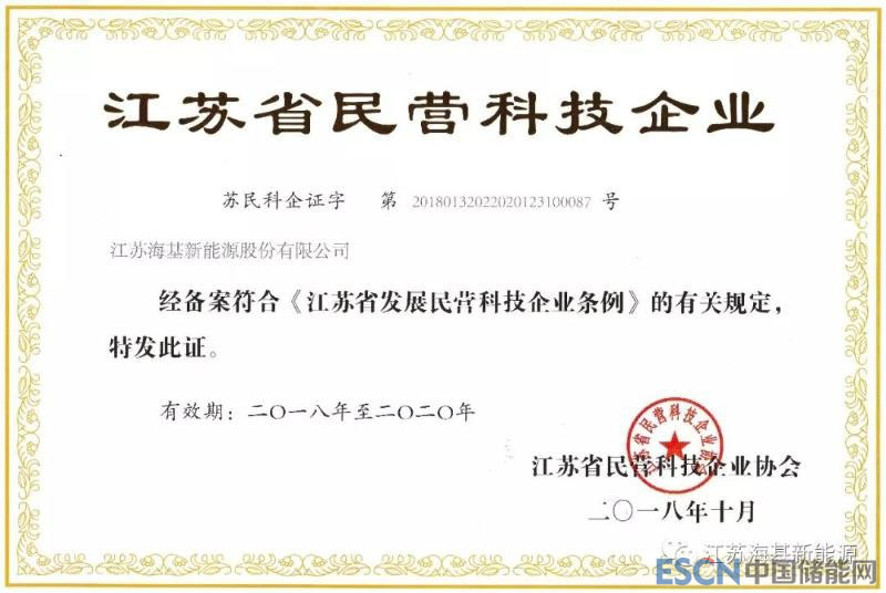 中國儲能網(wǎng)訊:2018年10月,經(jīng)江蘇省民營科技企業(yè)協(xié)會認(rèn)證,江蘇海基新能源股份有限公司符合《江蘇省發(fā)展民營科技企業(yè)條例》,正式獲得“江蘇省民營科技企業(yè)”稱號。
