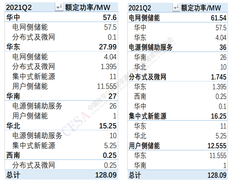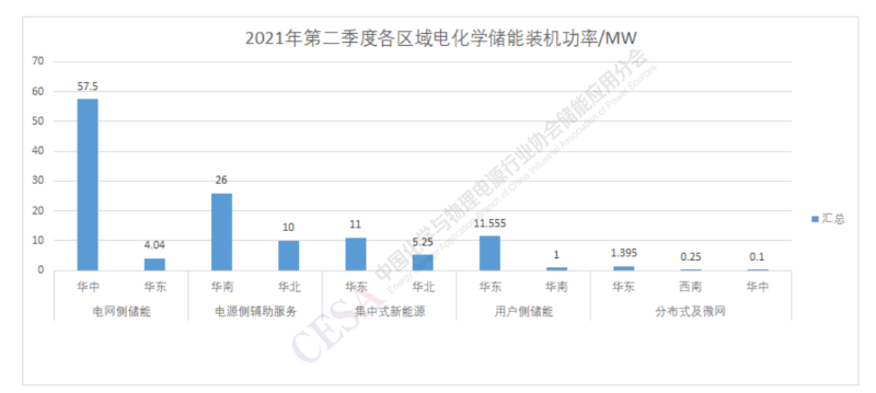2021年第二季度電化學(xué)儲能項(xiàng)目裝機(jī)中電網(wǎng)側(cè)儲能主要集中在華中和華東區(qū)域,電源側(cè)輔助服務(wù)主要集中在華南和華北區(qū)域。