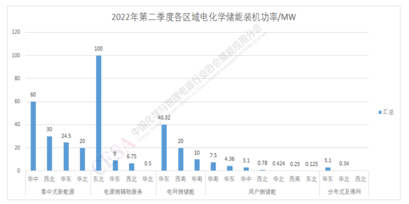2022年第二季度電化學(xué)儲能項(xiàng)目裝機(jī)中集中式新能源、電網(wǎng)側(cè)儲能和電源側(cè)輔助服務(wù)占比最大,其中集中式新能源儲能在華中、西北、華東、華北都有一定比例,分布也較為均衡,電網(wǎng)側(cè)儲能主要集中在華東、西南、華南等區(qū)域,電源側(cè)輔助服務(wù)儲能分布東北區(qū)域占大頭。用戶側(cè)儲能裝機(jī)功率規(guī)模較小,但分布較廣,各個區(qū)域基本上都有用戶側(cè)儲能項(xiàng)目投運(yùn)。