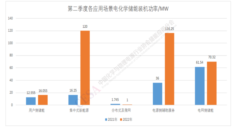 圖2 2021Q2-2022Q2電化學(xué)儲能各應(yīng)用場景裝機(jī)功率對比