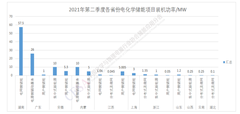 2021年第二季度電化學(xué)儲能裝機(jī)功率top5省份依次為湖南(4個)、廣東(2個)、安徽(2個)、內(nèi)蒙(2個)、江蘇(5個)