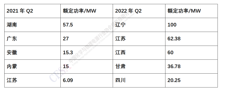 表1 2021Q2-2022Q2電化學(xué)儲能裝機(jī)功率TOP5省份