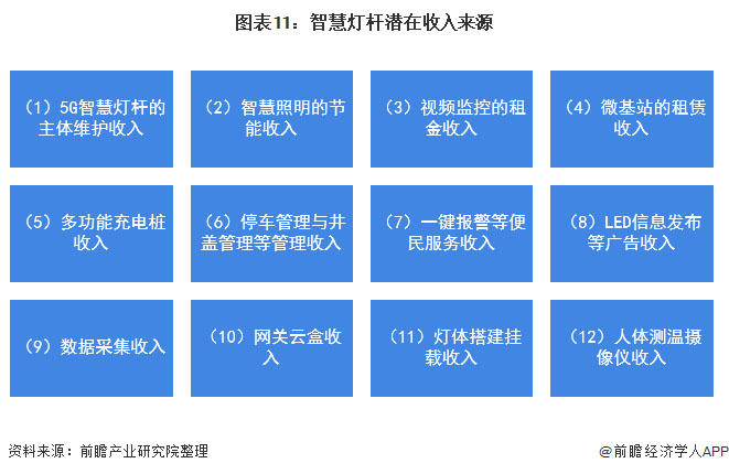 在此趨勢下,智慧燈桿行業(yè)發(fā)展前景廣闊,未來一片藍(lán)海。從企業(yè)/運(yùn)營商運(yùn)營角度出發(fā),智慧燈桿將產(chǎn)生多項(xiàng)運(yùn)營收入,如補(bǔ)貼、安裝、運(yùn)維、搭載、廣告、能源、基站、數(shù)據(jù)等都將帶來收入。