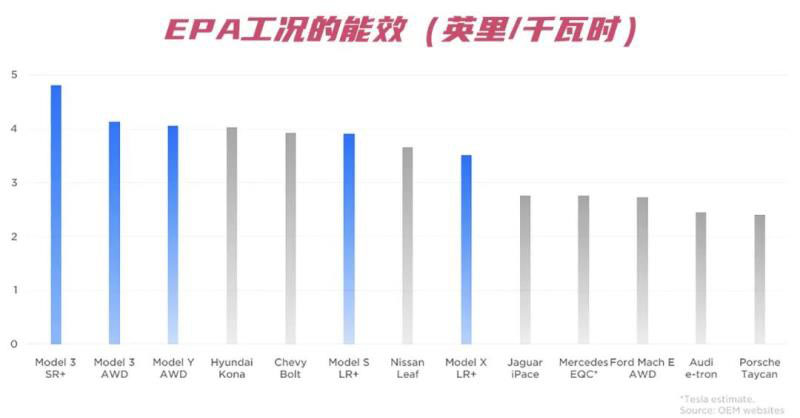 在Model S生產(chǎn)初期,EPA工況的能效為3.1英里/千瓦時?,F(xiàn)在,最高效的Model 3 Standard Range Plus(SR +)車型EPA工況的能效為4.8英里/千瓦時,“超過了目前投產(chǎn)的任何電動汽車”。Model Y全輪驅(qū)動EPA工況的能效為4.1英里/千瓦時,這使其成為“迄今為止生產(chǎn)的最高能效電動SUV”。