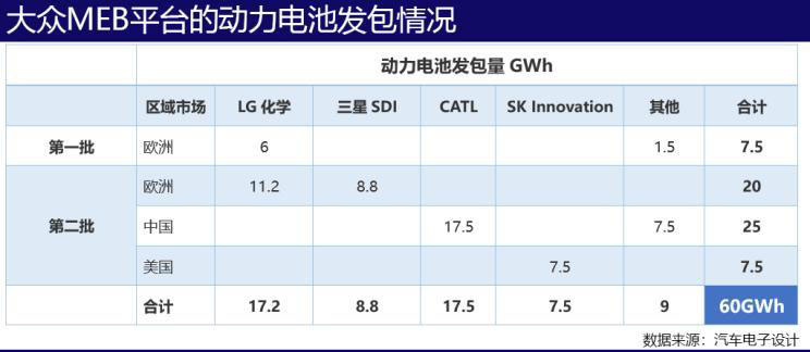 以大眾為例,其MEB平臺已分四批鎖定了不同的電池供應(yīng)商,前兩批采購量是60GWh,供應(yīng)商是清一色的亞洲供應(yīng)商,寧德時(shí)代拿到了最大的單子。