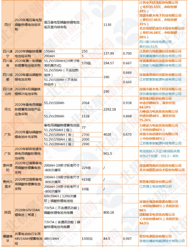 從中標企業(yè)來看,雙登集團、圣陽電源等鉛酸電池龍頭企業(yè)也在磷酸鐵鋰的采購中奪得多個大份額項目,此外在動力電池、儲能電池市場的熱門選手力神電池、中天科技等也參與中標了部分標包,近期億緯鋰能也表示與中國鐵塔達成了合作。另外值得注意的還有深圳康普盾科技股份有限公司、江蘇智泰新能源科技有限公司、深圳市新木電子科技有限公司、浙江佳貝思綠色能源有限公司等企業(yè)也有參與并多個項目投標并獲得部分中標。