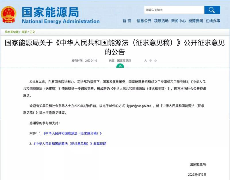 近日,國家能源局就《中華人民共和國能源法(征求意見稿)》公開征求意見。