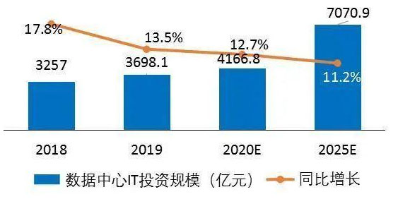 孫會(huì)峰指出,2019年中國(guó)數(shù)據(jù)中心IT投資規(guī)模達(dá)3698.1億,預(yù)計(jì)2020年這一規(guī)模將增長(zhǎng)12.7%,達(dá)到4166.8億元;而到2025年,預(yù)計(jì)這一投資規(guī)模將達(dá)到7070.9億元。