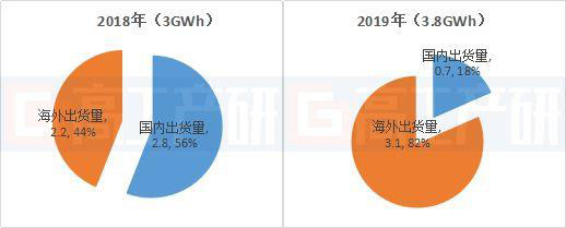 2018-2019年中國(guó)儲(chǔ)能鋰電池出貨量(分國(guó)內(nèi)和海外)