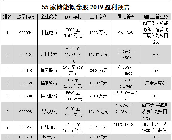(注:55家A股儲(chǔ)能相關(guān)上市公司中,尚有20家未披露2019業(yè)績(jī)預(yù)告)