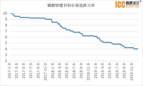 這是一個(gè)來自于鑫欏資訊的統(tǒng)計(jì),由于新能源乘用車市場轉(zhuǎn)向三元鋰電池體系,從2017年1月起,磷酸鐵鋰正極材料的價(jià)格逐步下跌,從10萬元跌到了現(xiàn)在的4萬元。