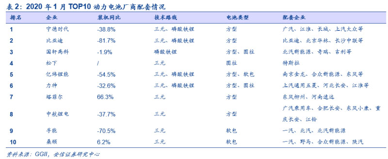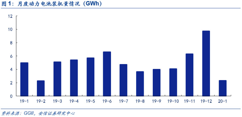 1月電池裝機(jī)的大幅下滑在預(yù)期之內(nèi),2月預(yù)計仍將受疫情影響。2019年1月受行業(yè)提前搶裝應(yīng)該呈現(xiàn)高基數(shù),疊加今年春節(jié)假期提前,導(dǎo)致1月新能源車銷量及動力電池裝機(jī)量均有大幅下滑,在市場預(yù)期之內(nèi)。2月份受疫情影響,預(yù)計產(chǎn)業(yè)鏈生產(chǎn)有2-3周影響,因此2月市場表現(xiàn)仍較弱。