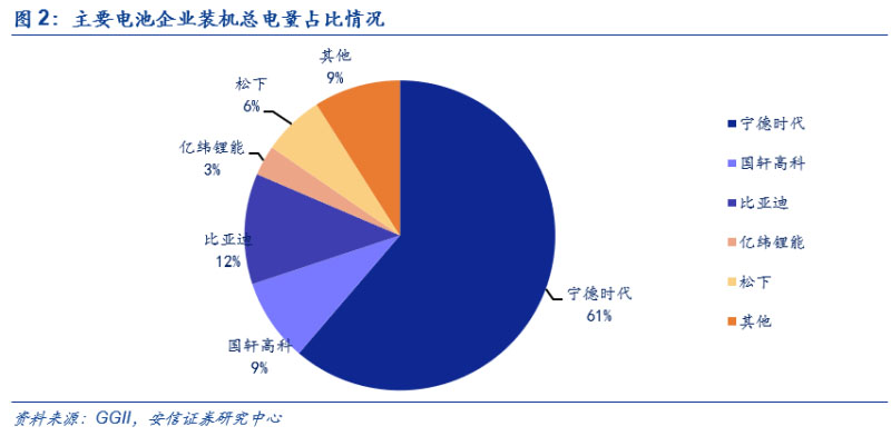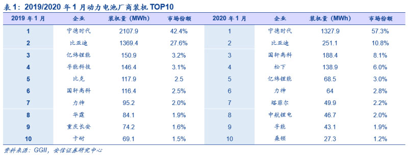 根據(jù)GGII動力電池裝機(jī)數(shù)據(jù),2020年1月我國共實現(xiàn)動力電池裝機(jī)2.32GWh,同比下滑52%。其中乘用車電池裝機(jī)1.70GWh,同比下滑52%;客車裝機(jī)0.45GWh,同比下滑64%;專用車裝機(jī)0.17GWh,同比下滑21%。電池裝機(jī)排名前三廠商分別為寧德時代、比亞迪、國軒高科,其中寧德時代裝機(jī)份額達(dá)到57%,維持高位。