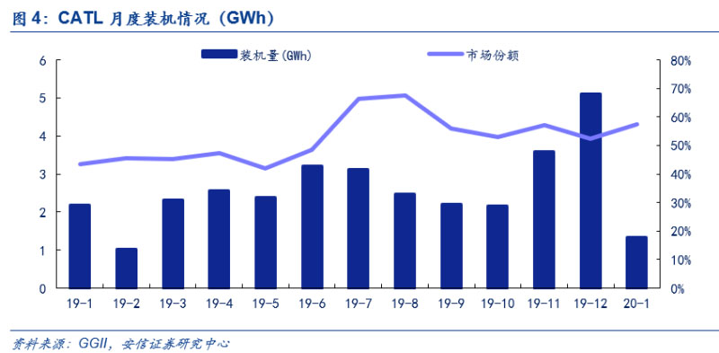 寧德時代裝機(jī)份額維持高位。2020年1月,CATL實現(xiàn)動力電池裝機(jī)1.33GWh,市場份額57%,遙遙領(lǐng)先行業(yè)。自2019年三季度以來,公司市占率始終維持在55%的高位。具體從產(chǎn)品類型來看,2020年1月CATL動力電池裝機(jī)中,乘用車裝機(jī)量占比71%;客車占比27%;專用車占比3%,這一結(jié)構(gòu)較2019年1月的乘用車/客車/專用車分別64%/34%/2%相比,乘用車貢獻(xiàn)比重有所提升。